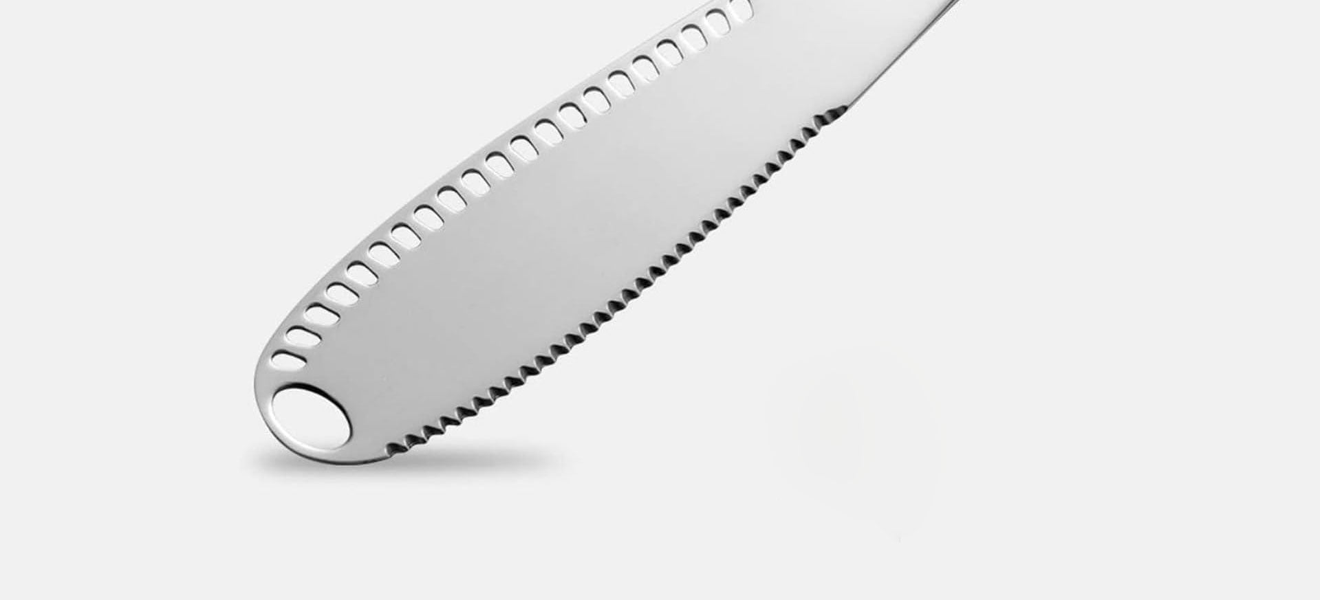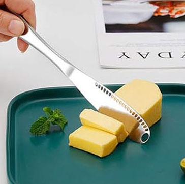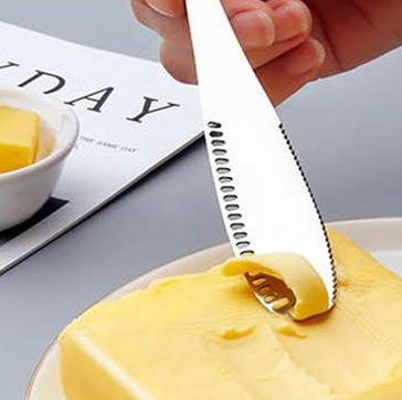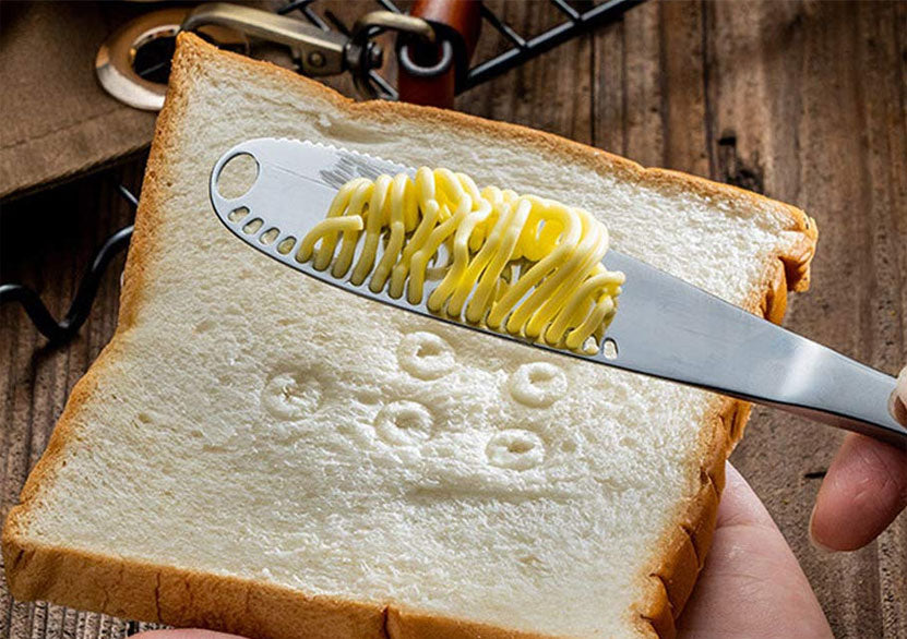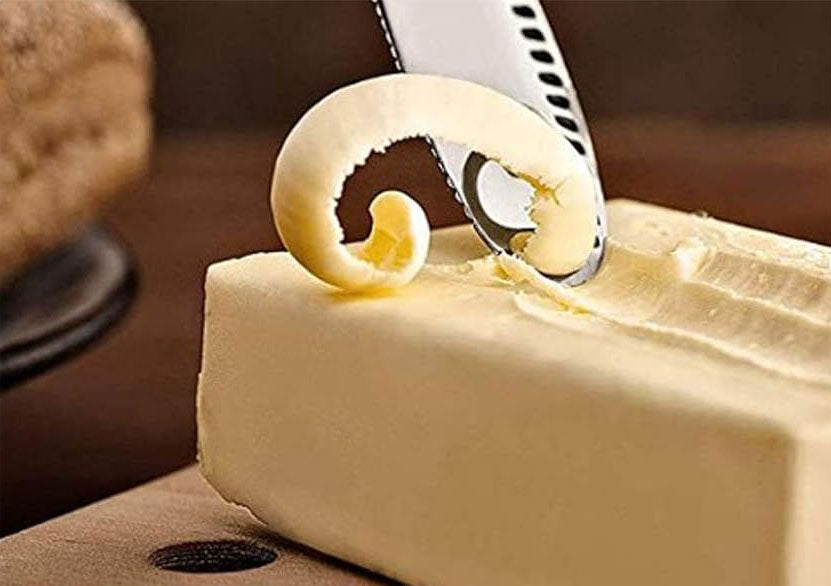 The serrated edge can cut through toast, while the small holes along the edge of the knife can create spaghetti-like butter strips that deliver excellent spreading Consistency for anything from toast to pancakes. The large single hole in the end of the knife can produce similar but much larger spaghetti-like butter or cheese strands.