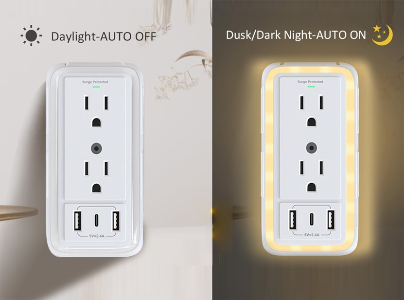 - Multi-function USB Outlet: 2 USB fast charging ports, 3-sided Power Strip, with 6 Adapter Spaced Outlets, and LED night light around the edges. Taking the place of a standard socket, but instead offering you many more plugs. Can be used in any room or public areas indoor. Save space with unique 3D design.
